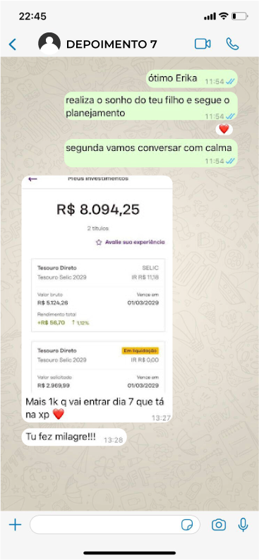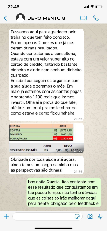 Criar planilhas qualquer um sabe fazer, mas é aqui que vem o diferencial da consultoria… Implementando o plano de ação irei te acompanhar muito de perto para que tudo o que foi planejado seja executado, sem que você precise se preocupar com nada, pois toda a parte técnica de análise, pesquisa, gestão, negociação, estratégias, recomendações... é de minha responsabilidade, onde além de te guiar diariamente te instruindo como tudo deve ser feito, também te ensinar a lidar com o seu dinheiro para nunca mais repetir essa situação e sempre estar na direção certa para crescer financeiramente e realizar teus objetivos.